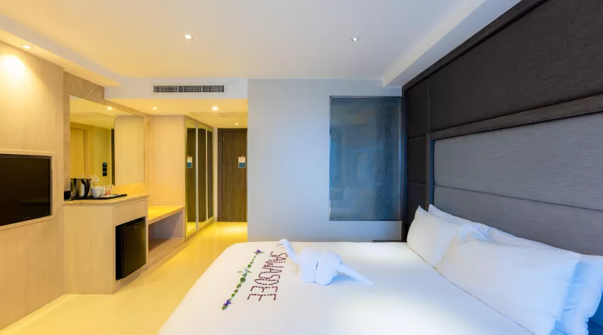 Designed for the comfort of modern travellers, the Deluxe rooms feature a functional living space of 26 square metres and a private balcony where you can admire the city views. Freshen up in an airy bathroom, relax on your queen-sized bed and enjoy your favourite shows on the big smart TV.